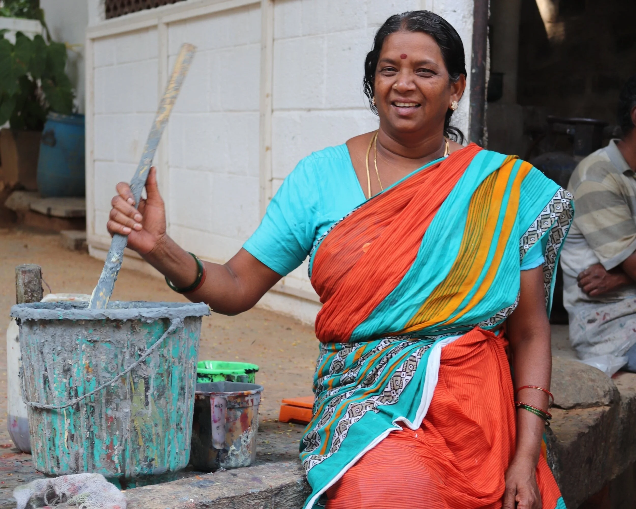 Banu works at our Sustainable block printers in Bangalore, mixing dyes for the block printers to use. She carefully mixes the dyes so that they are just the right colour.